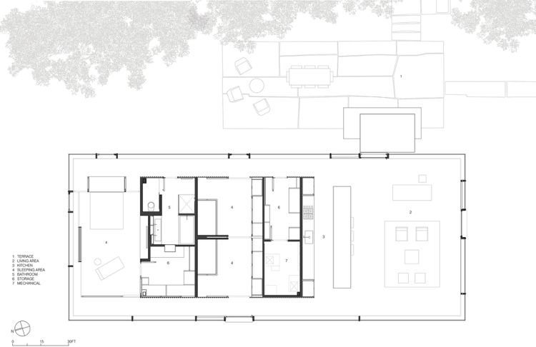Terénne úpravy a dizajn vonkajších zariadení úzko súviseli s návrhom domu. Nehnuteľnosť obklopuje obmedzený sortiment pôvodných rastlín a ďalšie prírodné zaujímavosti. Panely miestneho pôvodu z brúseného kameňa a bridlice vytvárajú základ pre vonkajšie miesta na sedenie a chodníky. Terasa medzi domom a blízkym borovicovým lesom poskytuje príjemný vonkajší priestor na zábavu a stolovanie. Bluestone stupačky vedú z terasy na miesto na grilovanie a vonkajšiu sprchu v lese.