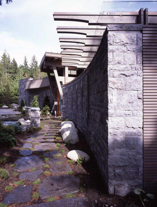 Budova má plán, ktorý umožňuje použiť veľa skla na fasádu. A sklo je niečo tento dom potrebné na to, aby odrážali nádhernú modrú oblohu a ponúkli úchvatné výhľady. Predná fasáda domu je pokrytá cédrom a meďou. K dispozícii je veľká zaoblená terasa s výhľadom na hory. Terasa spolu so zaujímavou strešnou konštrukciou dodáva budove dramatický vzhľad. K hlavnému vchodu v zadnej časti rezidencie vedie kamenná cesta. Cestou k dverám si môžete vychutnať pokoj a ticho, ktoré v záhrade vládne. Samotná záhrada kombinuje kameň, stromy a bazén.