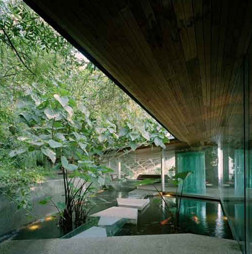 Záhrada je primeranej veľkosti. Je navrhnutý s drevenou podlahou a malými rybníkmi. Vďaka nemu dom vyzerá, akoby vychádzal z bohatej okolitej flóry. Toto Sklenený dom v Hollywoode je dobrým príkladom toho, ako by mala budova pôsobiť na prírodu.