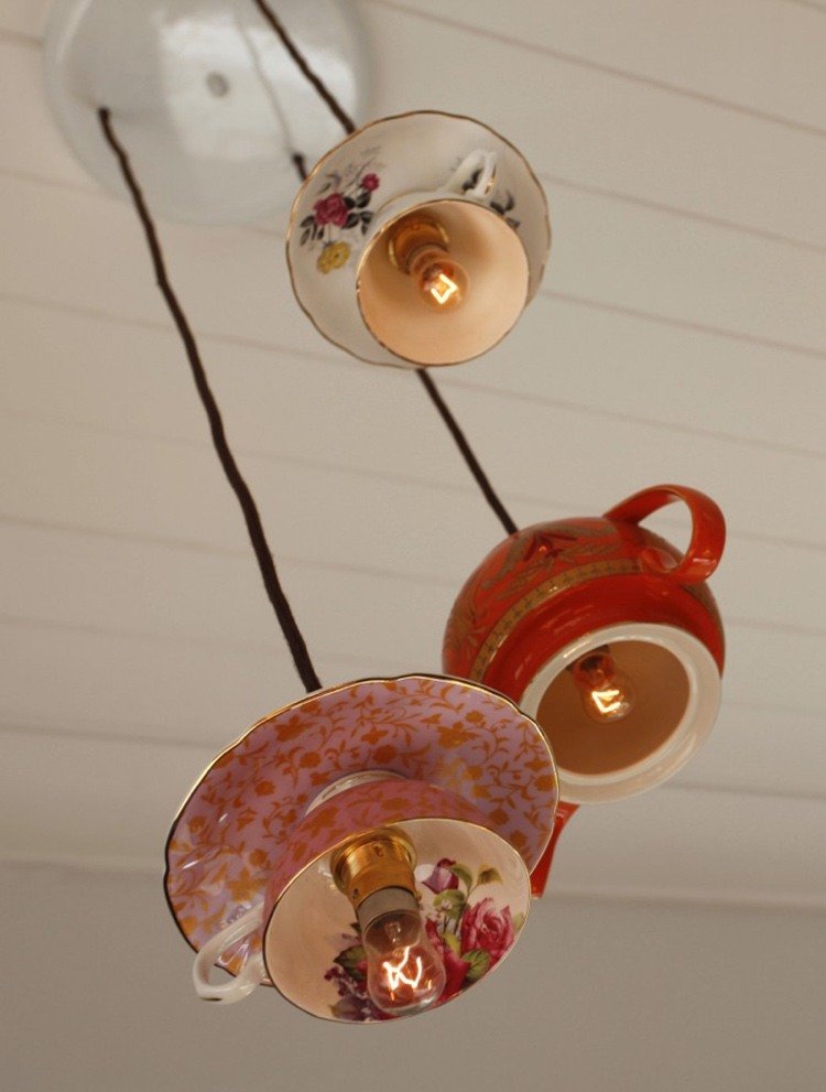 Závesná lampa vyrobená zo starej čajovej kanvice a šálok prináša vintage nádych do zimnej záhrady alebo obývačky. Závesné svetlo vyzerá veľmi dekoratívne a dodáva miestnosti nezameniteľný charakter.