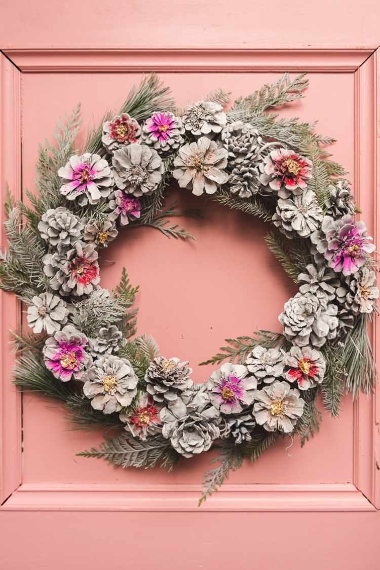 Veniec do dverí s kvetmi vyrobenými z borovicových šišiek a sušených listov stromov