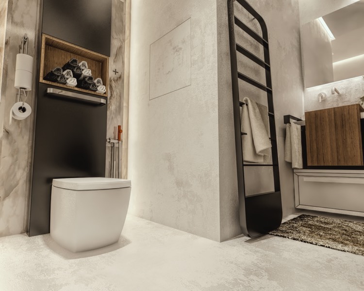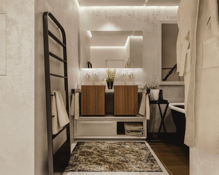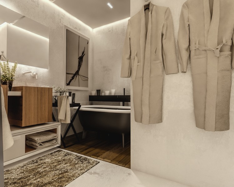Pri návrhu dvoch kúpeľní je v popredí opäť materiálová zmes pohľadového betónu, dreva a mramoru. Nepriame osvetlenie zaisťuje príjemné, rovnomerné osvetlenie a neoslňuje, ale vytvára ďalšie efekty.