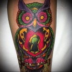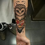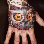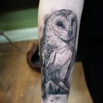 Bagolyos tetoválás az alkaron, zöld fényes szemekkel – Fotó