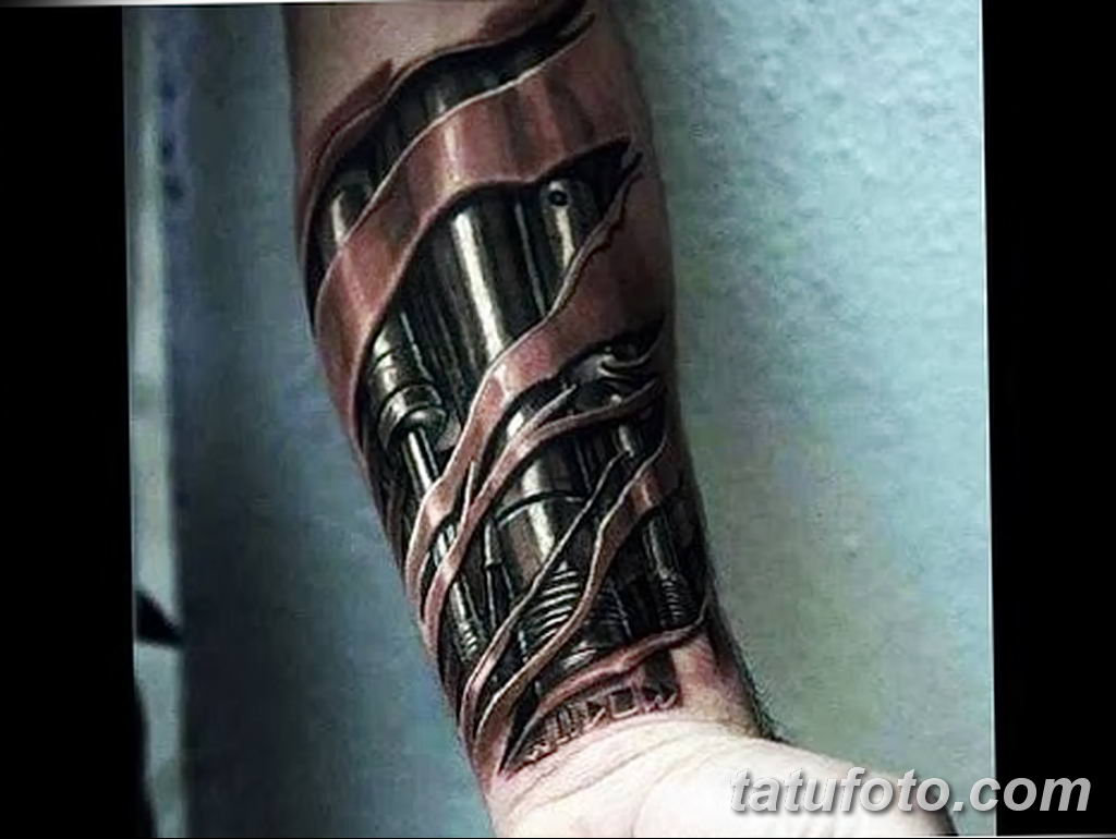 Биомеханиката и киберпънкът водят началото си от 21 -ви век, когато технологиите стават част от ежедневието на хората. Татуировката, направена в стила на реализма, показва, че връзката между човека и машината постепенно престава да бъде мит. Висококачествена татуировка от професионалист първоначално показва зъбни колела, бутала, устройства с бутони и чипове. Такива елементи в бъдеще може да са незаменима част от живия организъм. В по -голямата си част такива сюжети се нарисуват така, сякаш през увредена кожа се отваря изглед към вътрешните механизми. Често можете да намерите схематично изображение на вени под формата на сноп жици или метални плочи на мястото на костите..