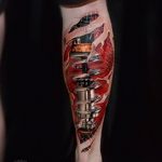 - Биомеханика. Изображение на разкъсана плът, през която се виждат части от технологични елементи според човешката анатомия.