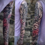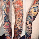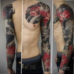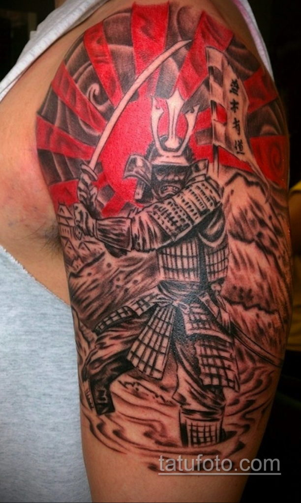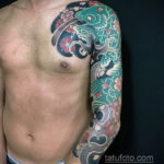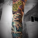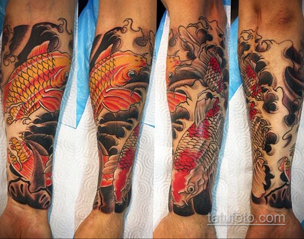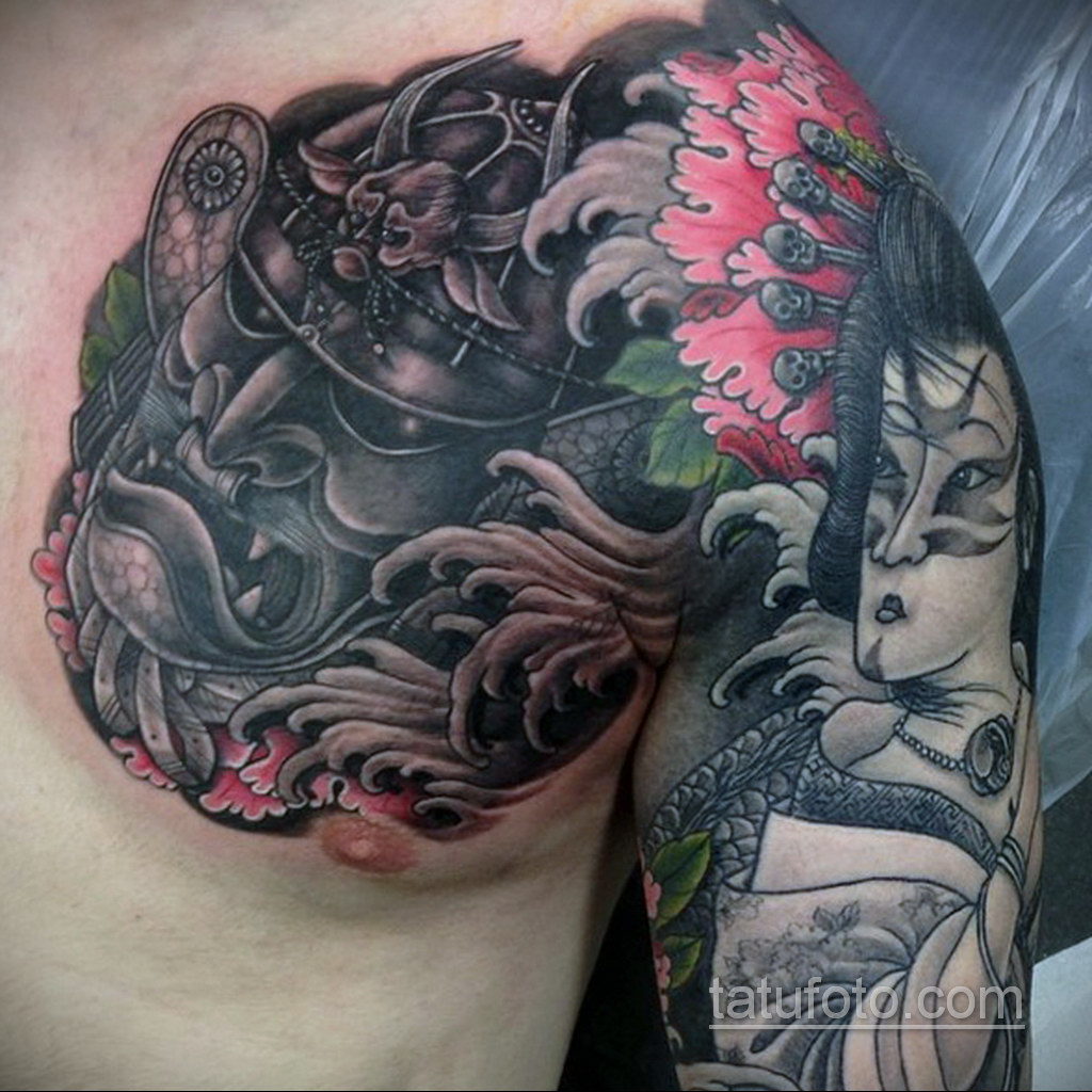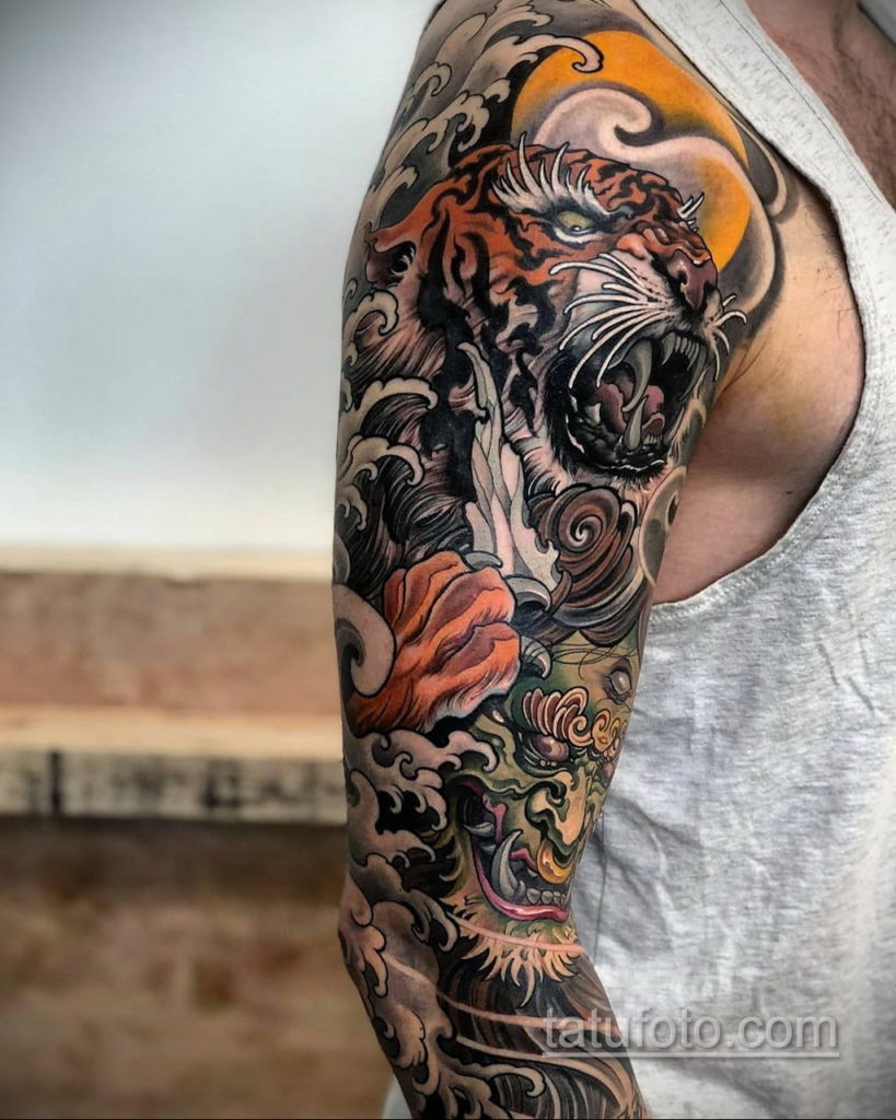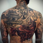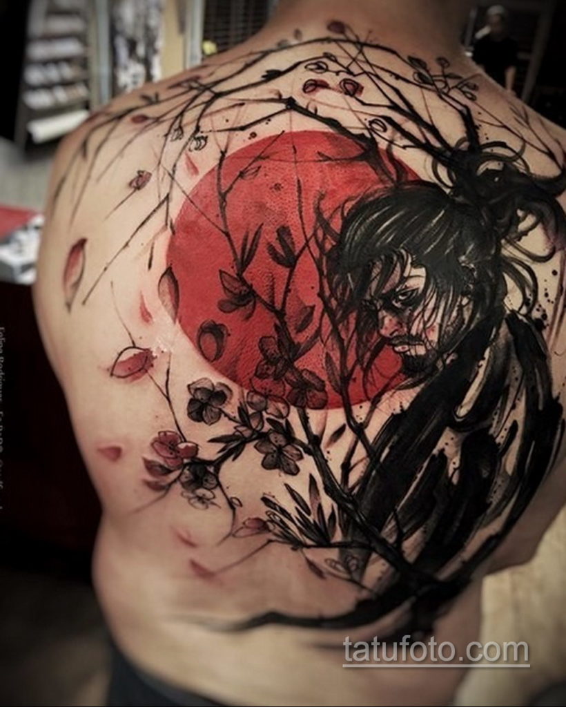 A háttér, mint általában, a keleti stílusú tetoválások a keleti flóra szépségét és a különféle szerves állatvilágot – lótuszvirágot vagy bazsarózsát – használják. Ezenkívül a keleti tetoválás hátterében térfogatú fekete hullámokat használnak, amelyek körben helyezkednek el..