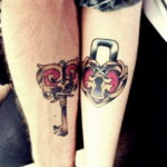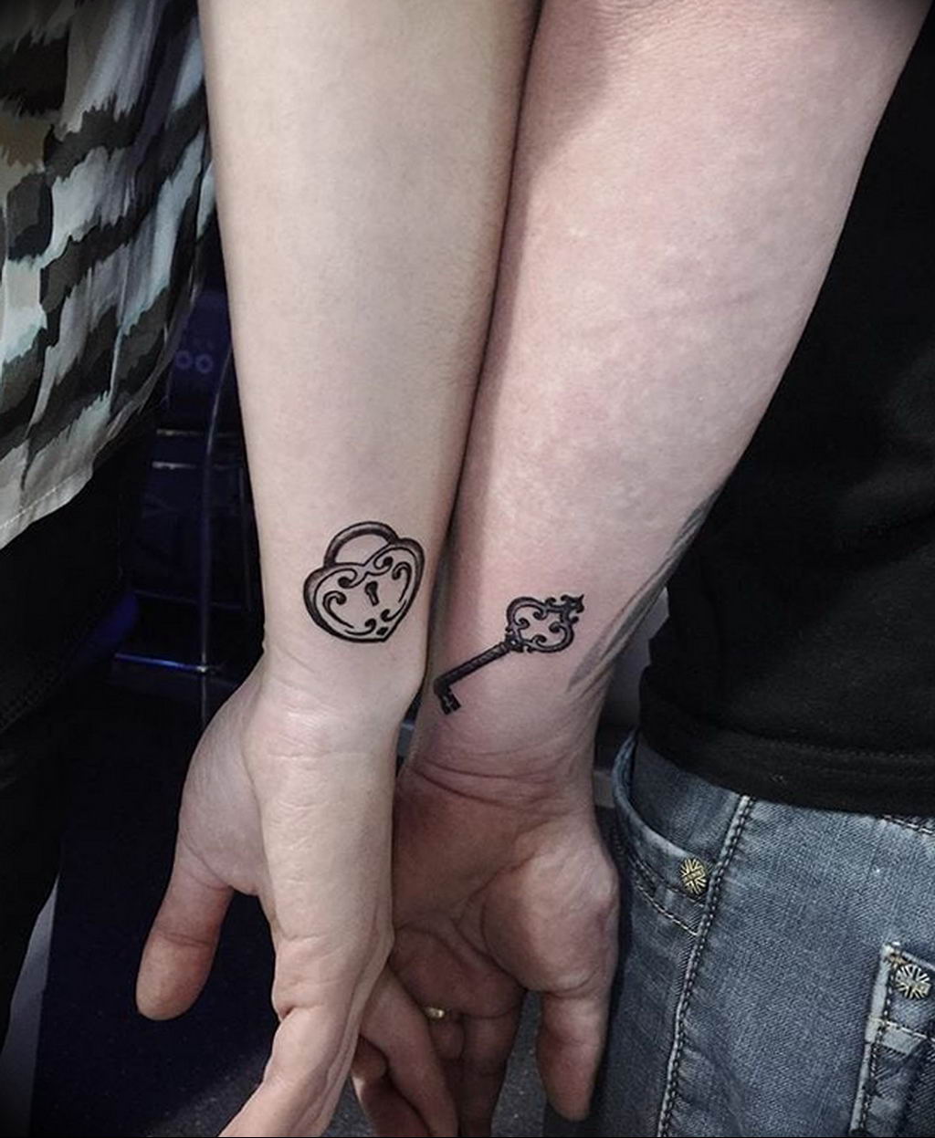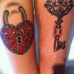 - Páros tetoválás két kulcs, szalaggal összekötve – a szeretetet és a ragaszkodást jelöli. Egy egésszé válik, ha a szerelmesek egymás kezét fogják.