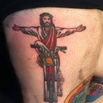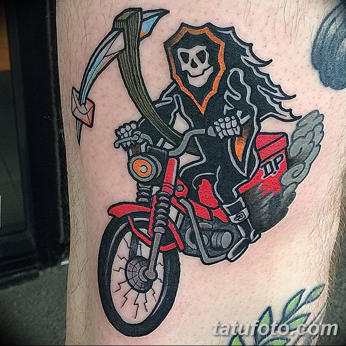 A motorkerékpár tetoválásokat gyakran koponyák, csontok vagy a halál képe egészíti ki. Az ilyen tetoválások azt mutatják, hogy egy személy többször volt az élet és a halál küszöbén. Vagy a kaszával való öregasszony iránti tisztelete, de ugyanakkor nincs félelem tőle. Bátorság a vakmerőség határáig.