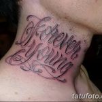 A “Forever young” még a nyakába is van töltve. Ezenkívül olyan lehet, mint egy kis függőleges tetoválás. Így van a vízszintes felirat is nagy betűkkel, áthaladva az egész nyakon az áll alatt.