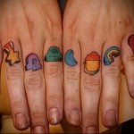 Az alábbi fotóválasztékban különböző, az ujjakra töltött tetoválások fényképeit láthatja belülről és kívülről egyaránt. Szintén itt láthatja az ujj oldalán készült tetoválásokról készült fényképeket..