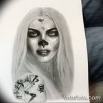 Vázlatok a Santa Muerto tetoválásokról – különböző típusú halálok: halál kaszával, bolygó, mérleg. De vannak kifinomultabb lehetőségek is. Ez egy lány, általában csak az arc, amelyen a koponya nyomon követhető. Vonalak a szájnál, amelyek hasonlítanak a varratokra, sötétednek a szemek és az orr, egy pókháló a homlokon, egy rózsa szőhető fekete hajba, gyakran kiegészítve fülbevalóval keresztek formájában.