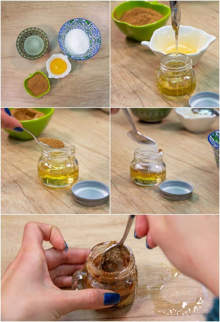 - Nalejte olivový olej do akejkoľvek sklenenej nádoby a potom pridajte med a škoricu.