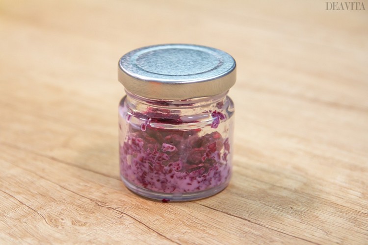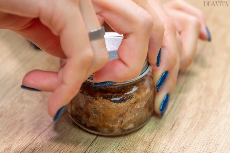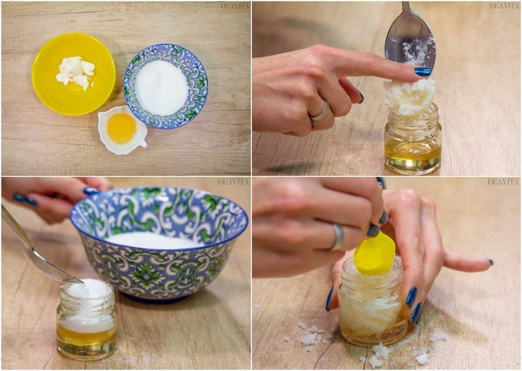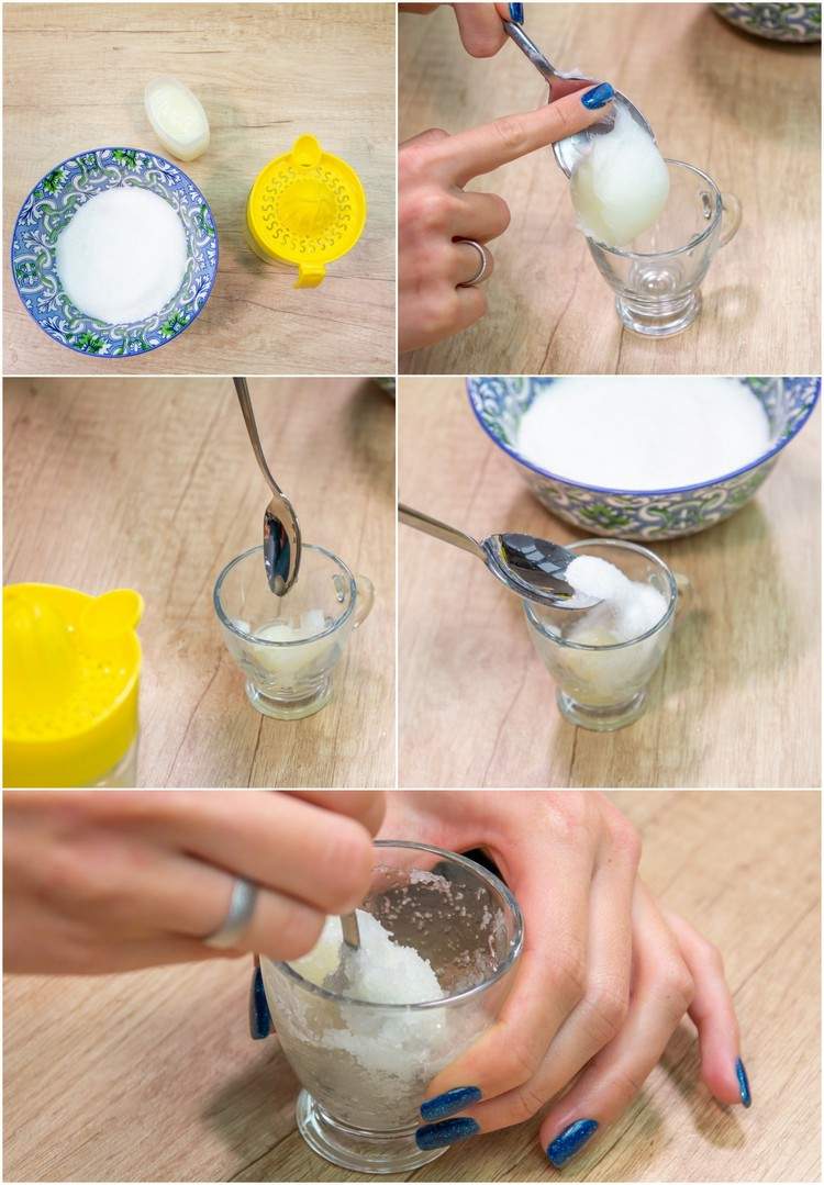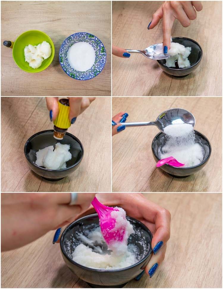- V pohári zmiešajte soľ a cukor a spojte ich s kokosovým olejom a vytvorte krémovú hmotu.