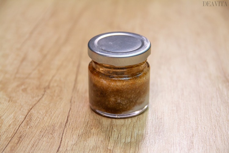 - Pridajte cukor a premiešajte všetky ingrediencie, až kým opäť nezískate krémový peeling.