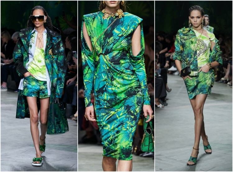 Keď hovoríme o šatách s tropickými vzormi, mali by sme samozrejme poďakovať Jennifer Lopez a jej dlhoročnému priateľstvu s Versaceom. Legendárna tropická tlač sa stala veľkým návratom pri predstavení Versace jar / leto 2020 počas milánskeho týždňa módy. Tentoraz Donatella Versace použila vzor džungle na vytvorenie veľkolepých šiat, košieľ, oblekov a mikín. Veľkým prekvapením módnej prehliadky bol vzhľad J.Lo, ktorý sa objavil v novom vydaní smaragdovo zelených šiat s potlačou palmových listov.