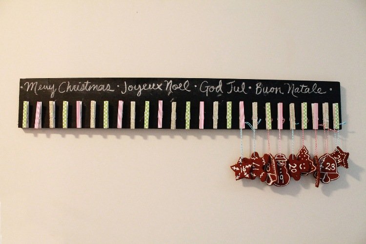 Ďalší nápad na efektný adventný kalendár môžete vidieť na obrázku vyššie. Na to potrebujete dosku, farbu (najlepšie farbu na tabuľu), štipce na bielizeň, pásku washi, horúcu lepiacu pištoľ a samozrejme chutné vianočné pečivo, ktoré ste upiekli a ozdobili na zimu. Dosku natrite tabuľovou farbou a nechajte farbu dobre zaschnúť. Potom môžete na už vysušenú farbu napísať kriedou „Veselé Vianoce“ alebo nechať dieťa nakresliť na ňu pekný obrázok.