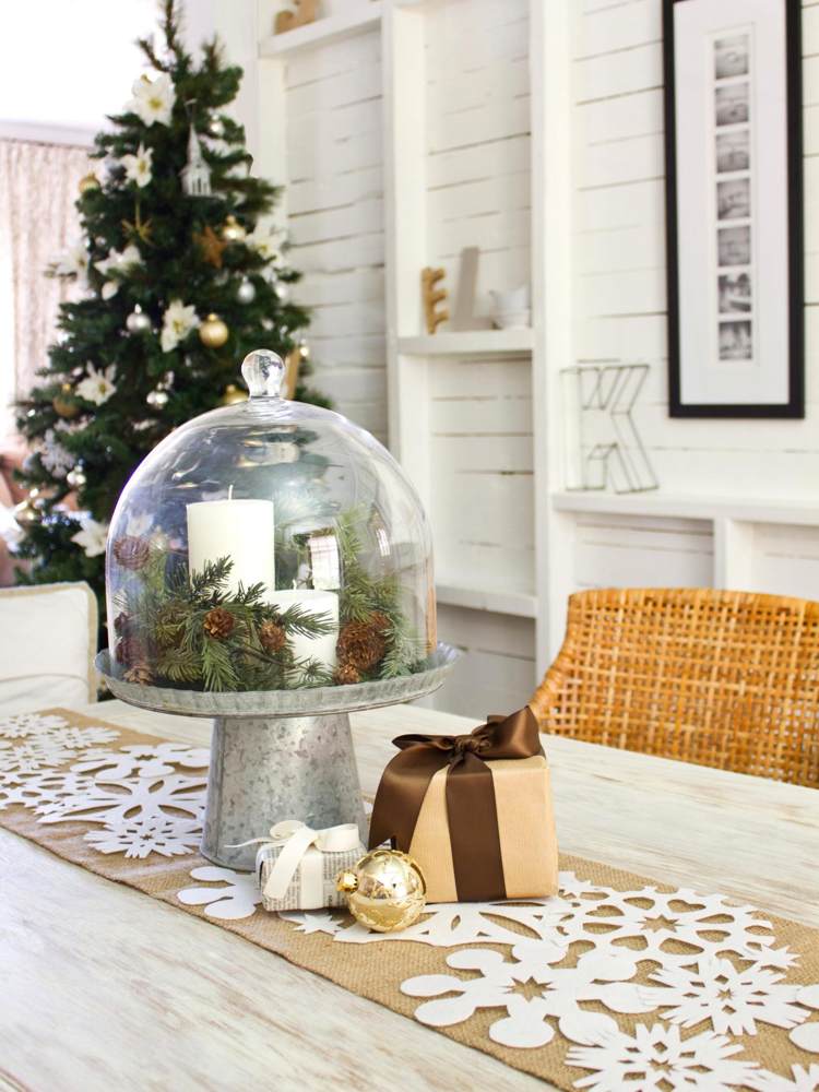 Ak chcete, aby bol stôl bežcom, rozložte snehové vločky na stôl a potom okraje zalepte malými prúžkami pásky. Aby ste sa mohli biele snehové vločky skutočne predvádzať, položte pod ne jutovú tkaninu. To vytvára slávnostnú, zimnú a príjemnú výzdobu stola s vintage nádychom!