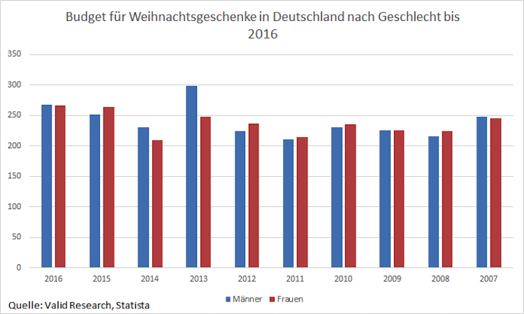 Rozdiel medzi mužmi a ženami, pokiaľ ide o míňanie peňazí na vianočné darčeky, nie je po väčšinu rokov od roku 2007 príliš veľký. Len v roku 2013 plánovali muži minúť na vianočné darčeky oveľa viac peňazí ako ženy.