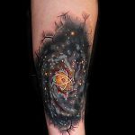 وشم الذرة هو رمز للإلحاد أو الإيمان بقوة العلم. يفكر صاحب وشمه بشكل تدريجي ، ربما يكون متحمسًا للعلم أو يعتبره مهنته. الذرة ليست رمزًا قديمًا ، وليست رونًا صوفيًا – إنها شيء جديد ومبتكر ، رمز للتقدم والحضارة ، اختراق في العلم.
