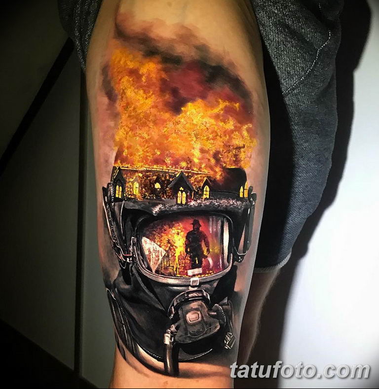 Следователно пламъците, които поглъщат къщата, често стават фон за татуировки на пожарникари. Това може да бъде пожарникар, който е изправен пред стихията, борейки се с него един на един. Или цяла история, където пожарникар изтича от огъня, пренасяйки спасените деца. Смисълът на такива татуировки е да съобщават с какво трябва да работи пожарникарят..