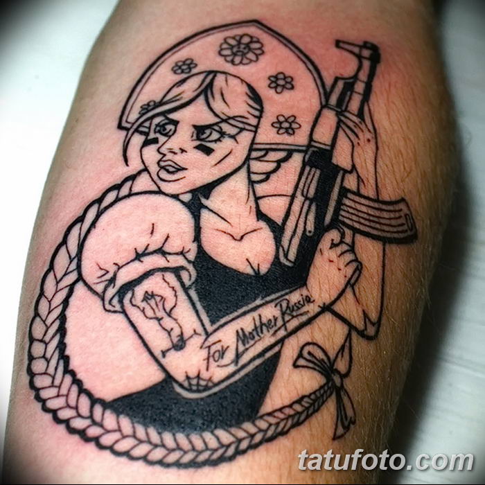 Често мъжете изобразяват върху телата си татуировка на автомата Калашников, създадена през 1947 г., това е мощна и най -известна щурмова пушка. Обикновено тази рисунка се натъпква по телата им от бивши военни, тъй като такава щурмова пушка им напомня за служба в армията. Но съвременната младеж отиде по -далеч и даде напълно различна интерпретация на татуировката. Те се пълнят с АК-47, демонстрирайки упорит силен характер и също символизиращи оръжия с противоречие..