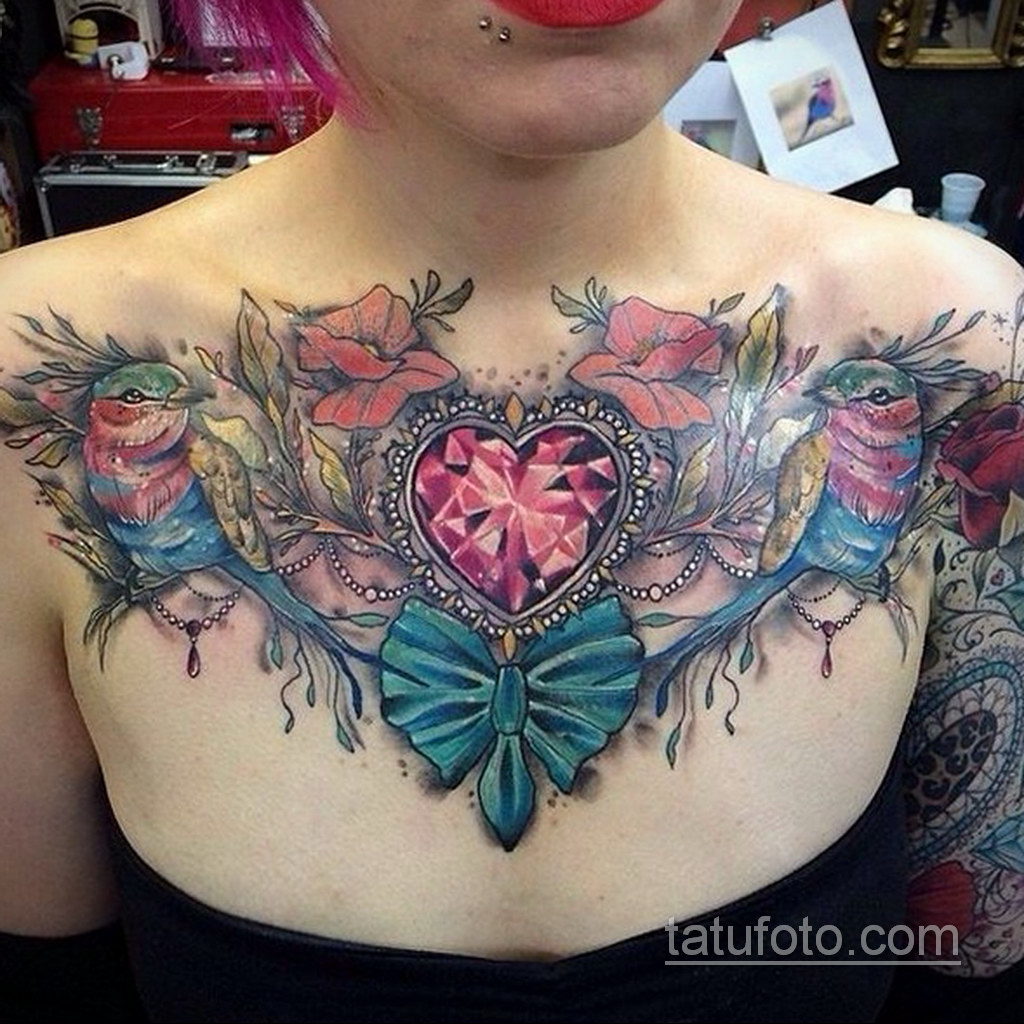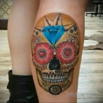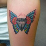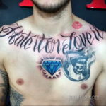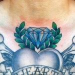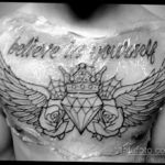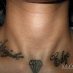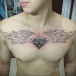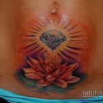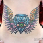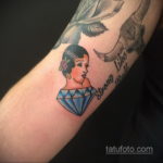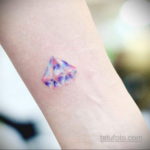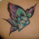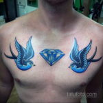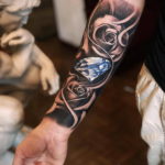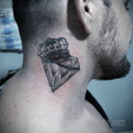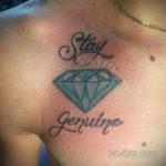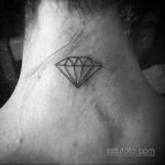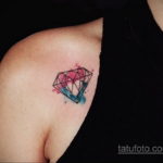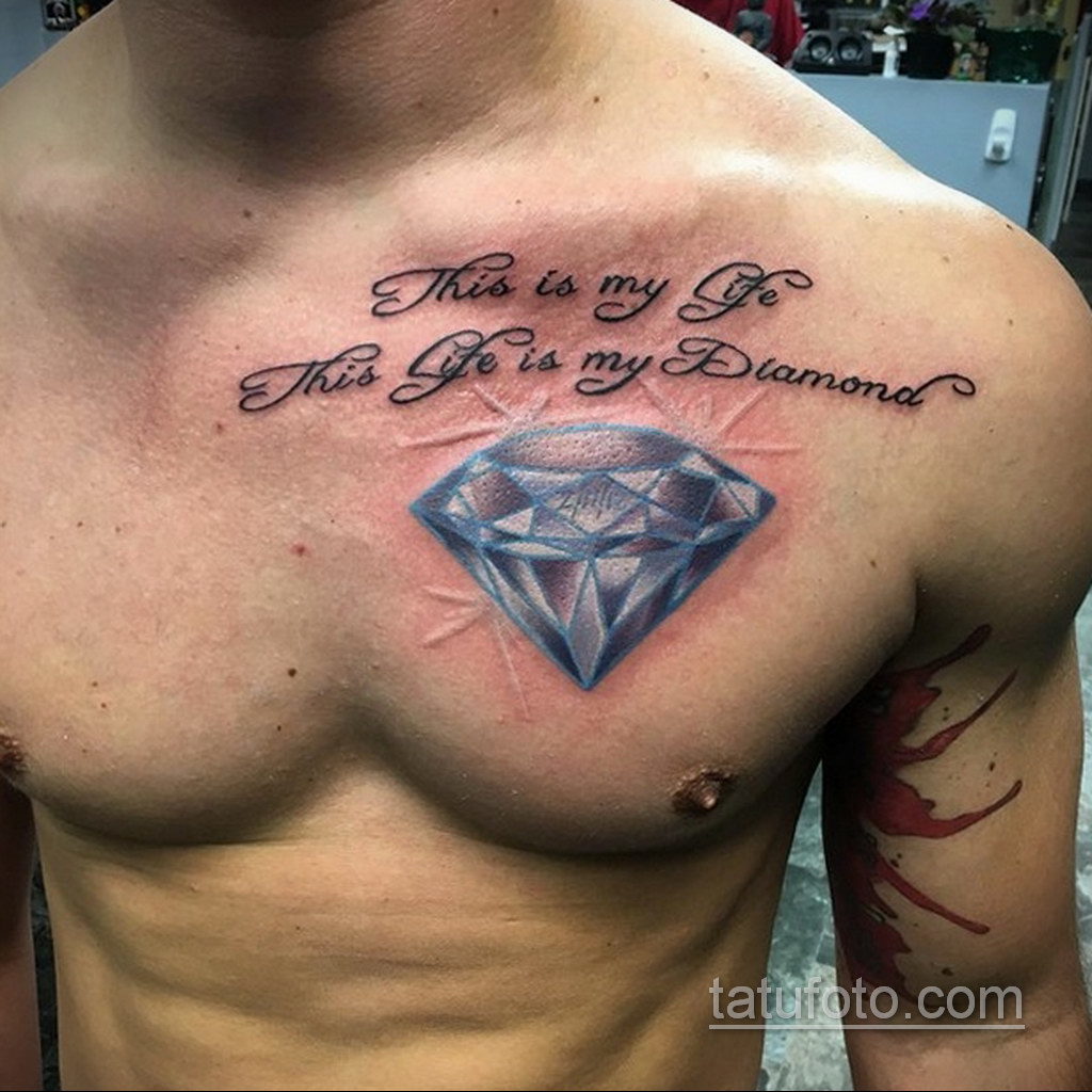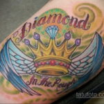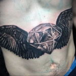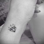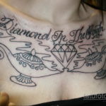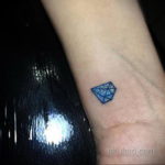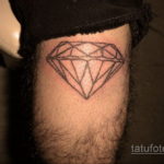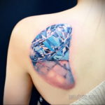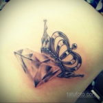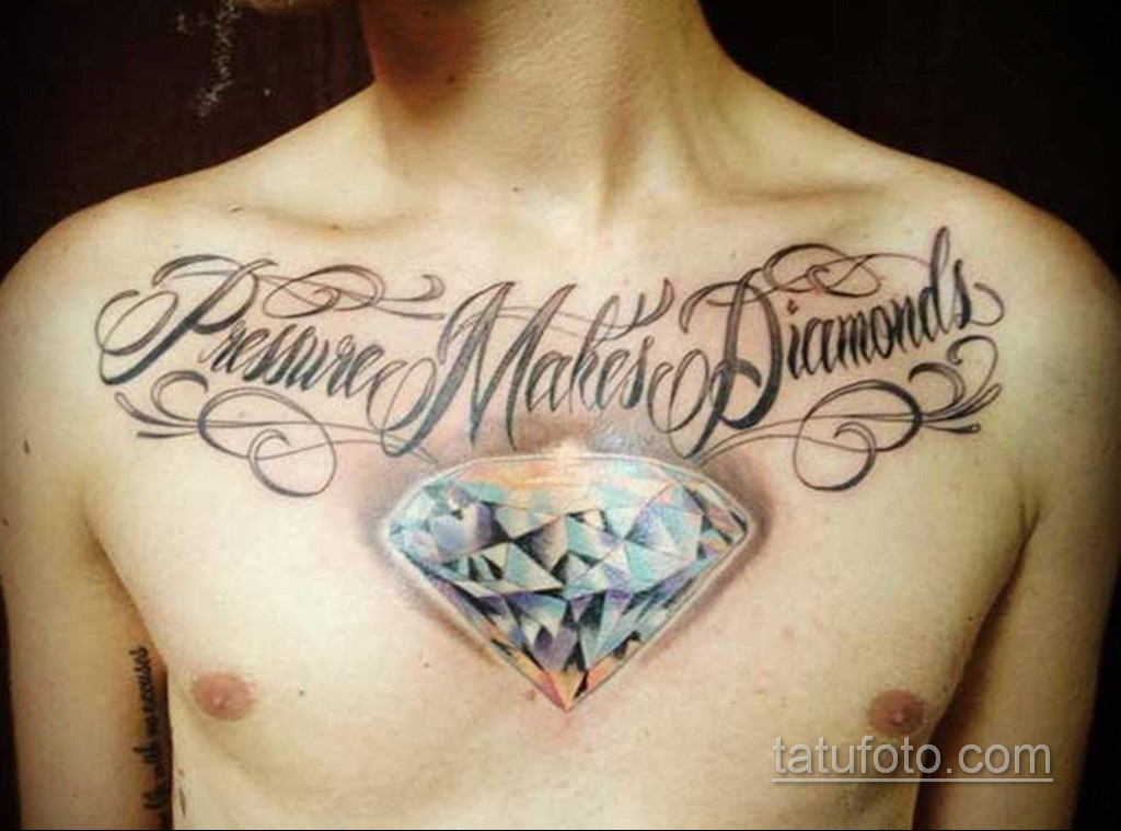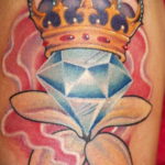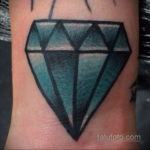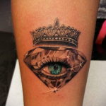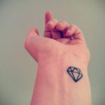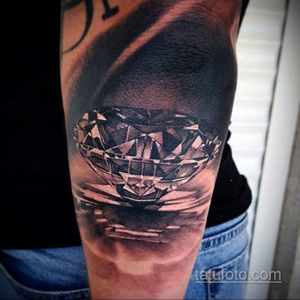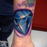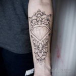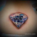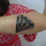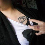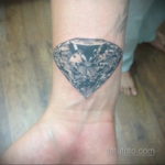 Диамантената татуировка илюстрира образа на такъв известен скъпоценен камък като Diamond. Такъв диамант се счита за камък на воини, древни монарси и епископи. В продължение на повече от едно хилядолетие този камък печели сърцата на хората със своя блясък на най -тънките си страни. Различни източници твърдят, че първият камък е намерен през далечния четвърти век пр.н.е., в красива страна – Индия. Дори тогава хората се възхищаваха на невъобразимо кристалната яснота на камъка, като едновременно съчетаваха уникална твърдост. Хората, които също имат тези черти на характера, изобразяват диамант върху тялото си..