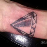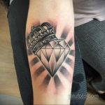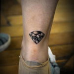 Диамантената татуировка илюстрира образа на такъв известен скъпоценен камък като Diamond. Такъв диамант се счита за камък на воини, древни монарси и епископи. В продължение на повече от едно хилядолетие този камък печели сърцата на хората със своя блясък на най -тънките си страни. Различни източници твърдят, че първият камък е намерен през далечния четвърти век пр.н.е., в красива страна – Индия. Дори тогава хората се възхищаваха на невъобразимо кристалната яснота на камъка, като едновременно съчетаваха уникална твърдост. Хората, които също имат тези черти на характера, изобразяват диамант върху тялото си..