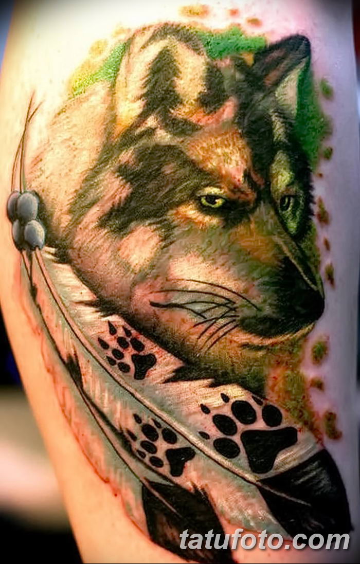 В татуировка с вълк могат да се използват пера от всяка птица, но се предпочитат перата на орел или бухал. Ценностите на перата имат повече духовна сила. Като: