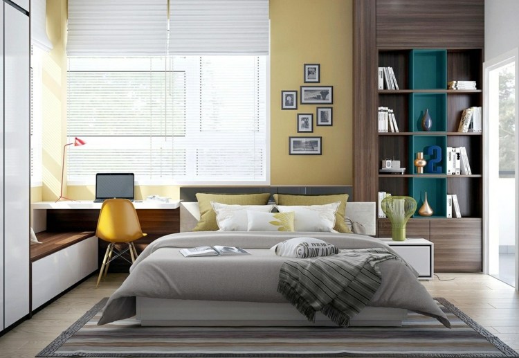 Táto spálňa je vyrobená výlučne z trendových farieb a je to skutočne priateľský a moderný priestor. Aby sa v tejto malej spálni zintenzívnilo príjemné svetlo, bola zvolená žltá farba steny, ktorá sa perfektne hodí k hnedému nábytku a sivým doplnkom.