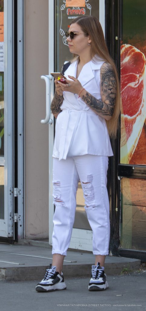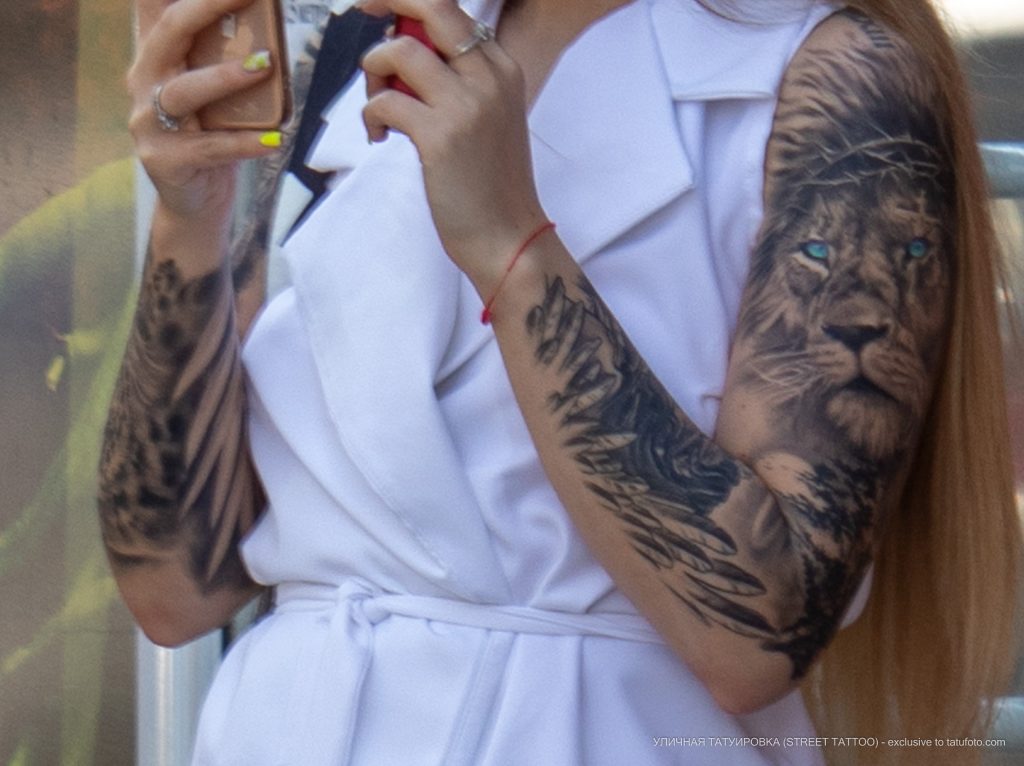 Zdjęcie dziewczyny z tatuażowymi rękawami – lew z niebieskimi oczami i skrzydłami – 05.09.2020 – Street tattoo – tatufoto.com