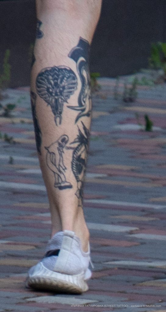 Zdjęcie tatuażu z hieroglifami na lewej nodze mężczyzny – 05.09.2020 – Street tattoo – tatufoto.com