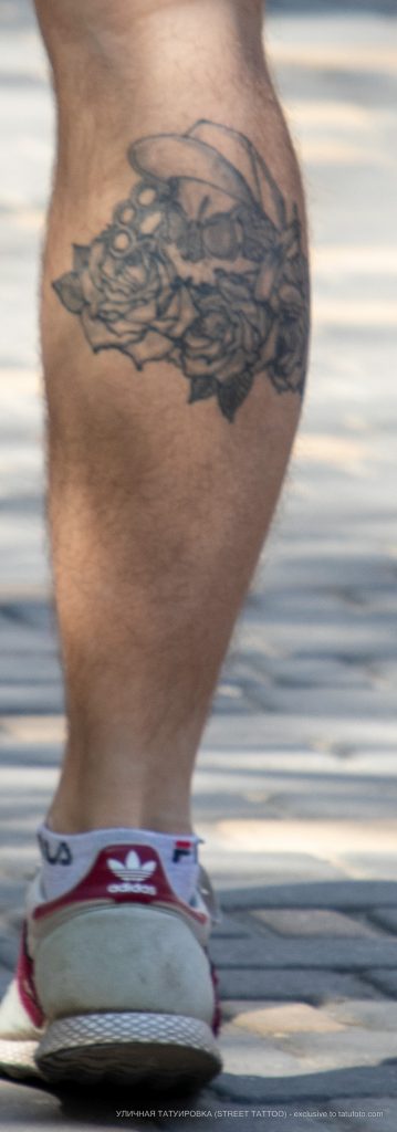 Zdjęcie tatuażu z czaszką w czapce obok mosiężnych kostek i róż na łydce faceta – 05.09.2020 – Street tattoo – tatufoto.com