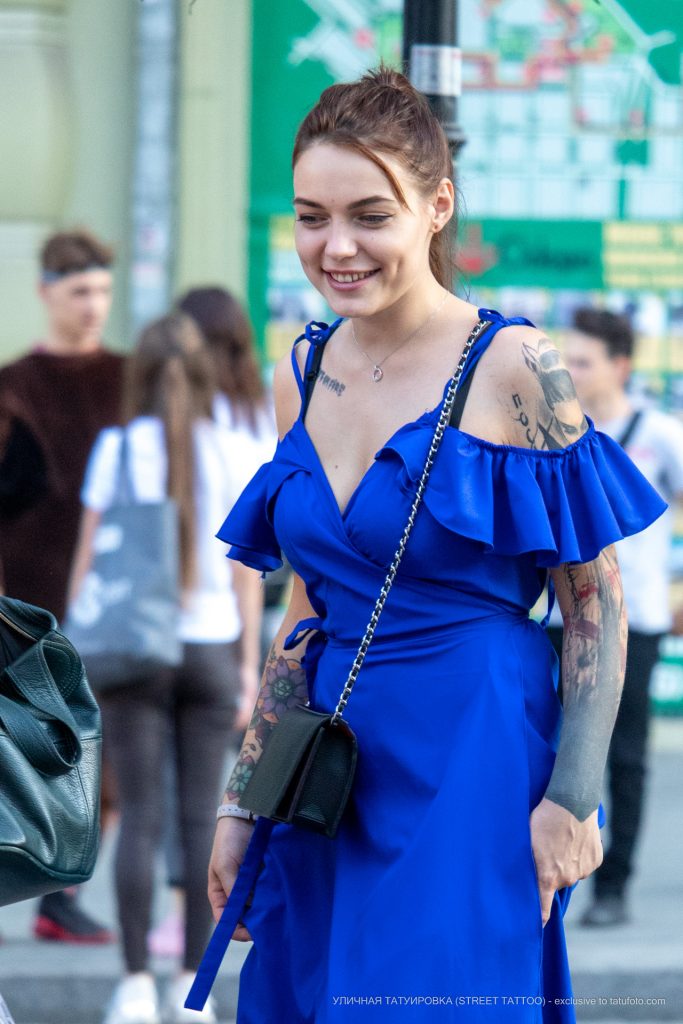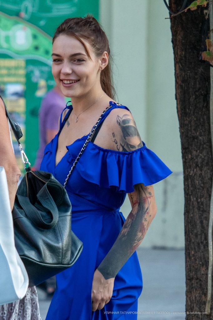 Dziewczyna w niebieskiej sukience z dużymi tatuażami w stylu treshpolka – blackwork i handpoke