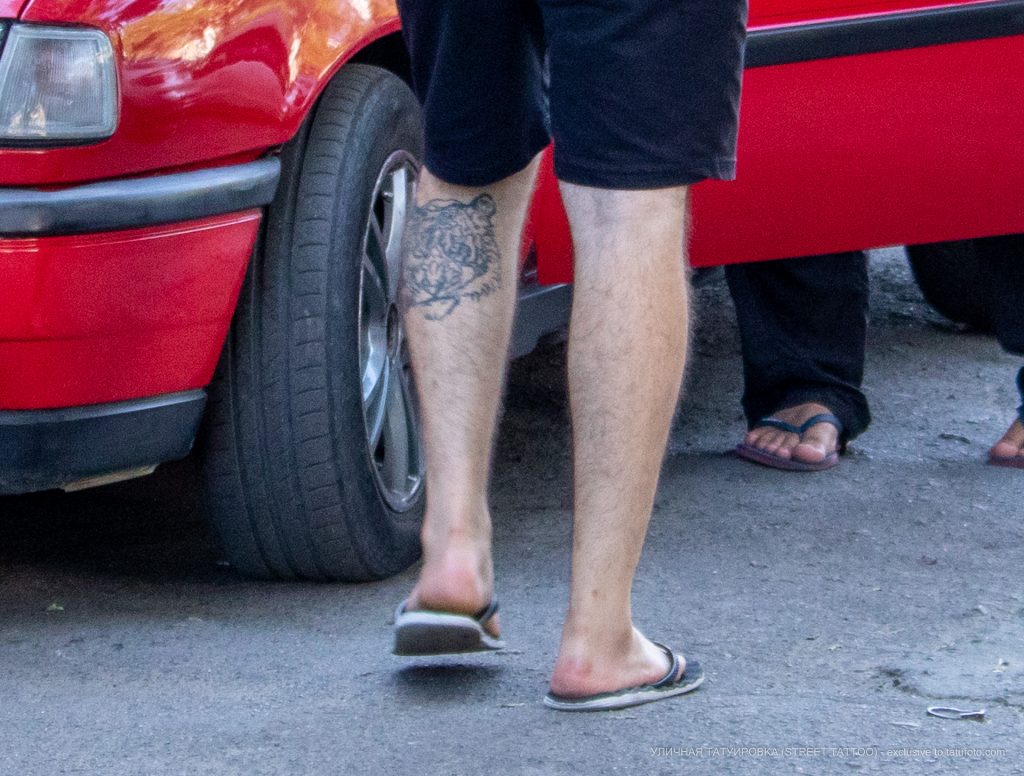 Zdjęcie nieudanego tatuażu z tygrysem na dole lewej nogi mężczyzny