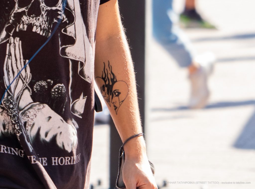 Tatuaż czaszki z twarzą dziewczyny i płomieniem na dłoni młodego faceta