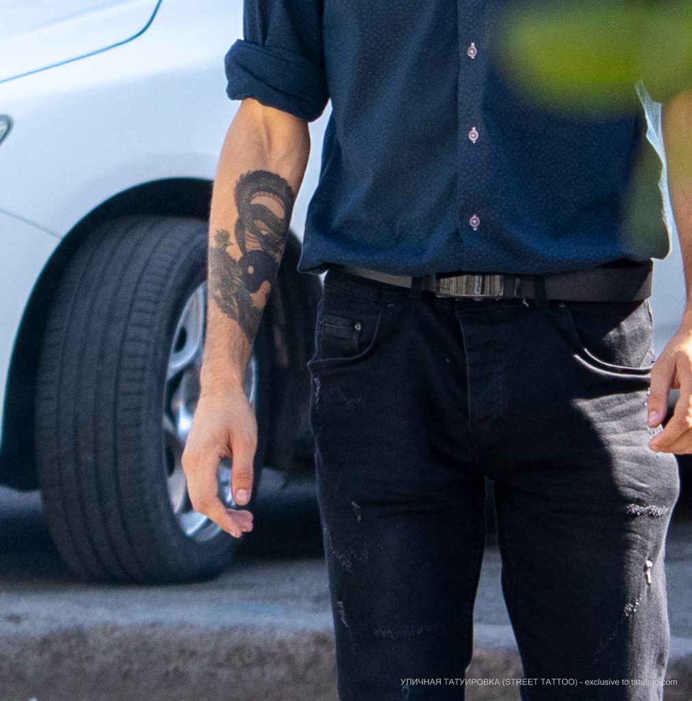 Nieudany tatuaż smoka na lewej ręce mężczyzny