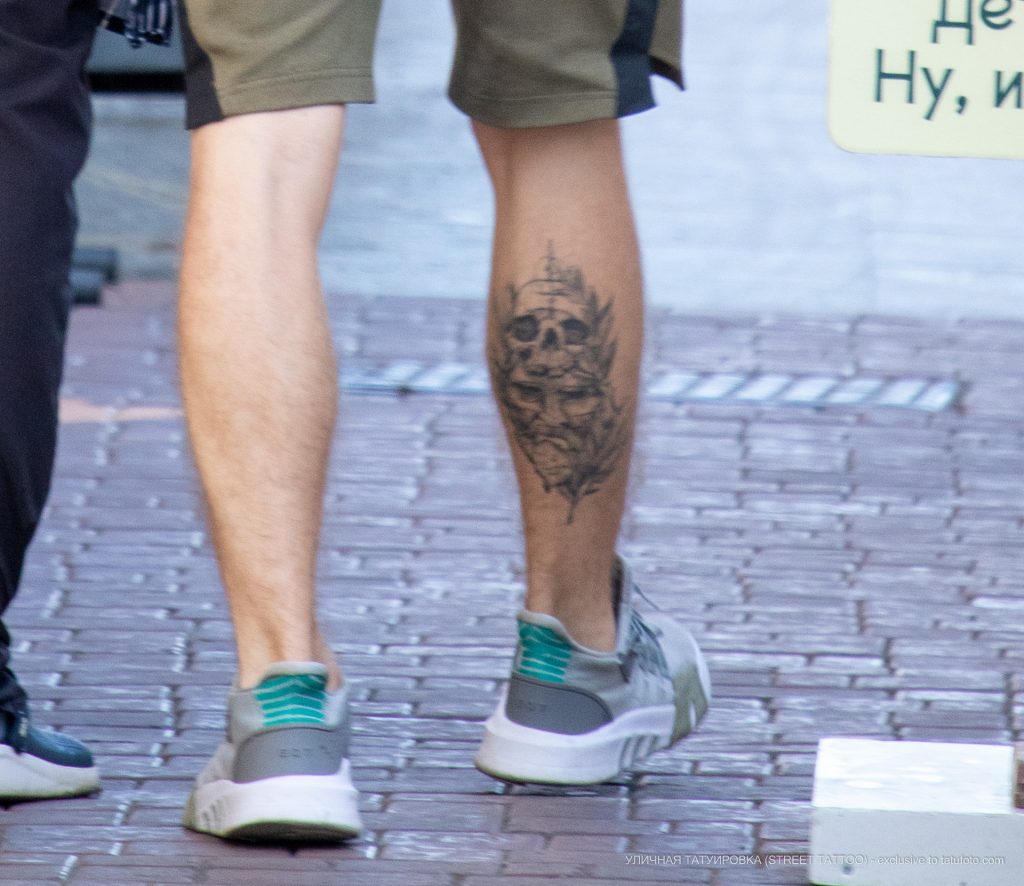 Rzeźba tatuażu – kruk i żaglówka na dole nogi faceta
