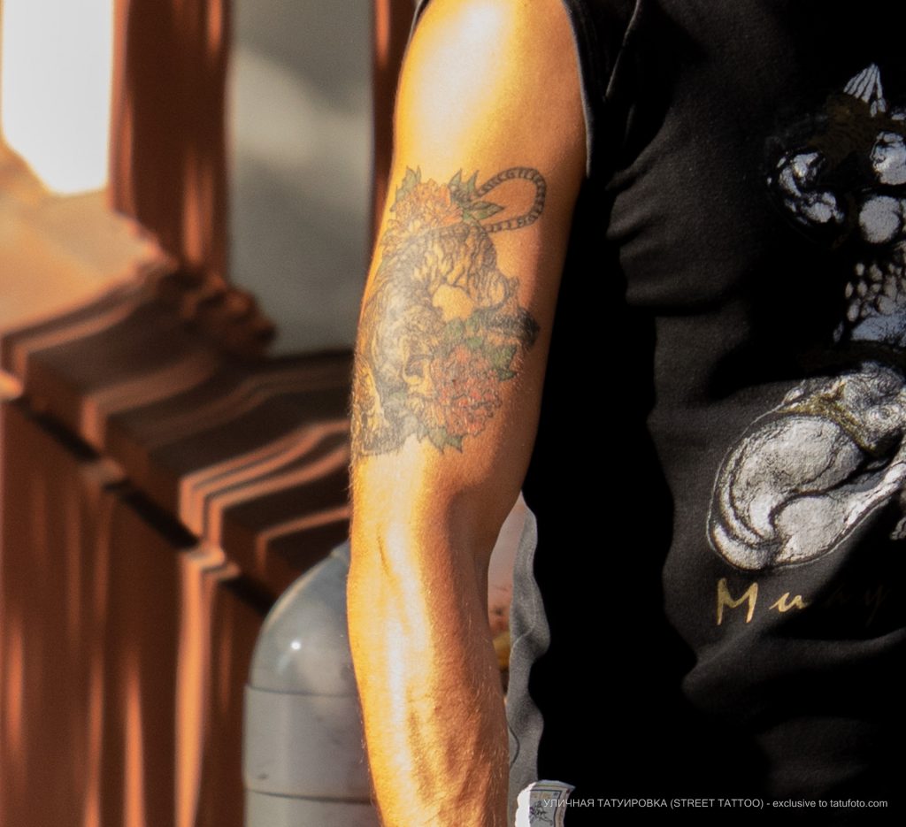 Duży tatuaż z kwiatami na ramieniu mężczyzny