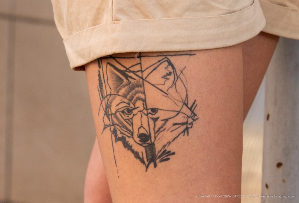 Młody facet z tatuażem zblazowanego wilka na dole nogi