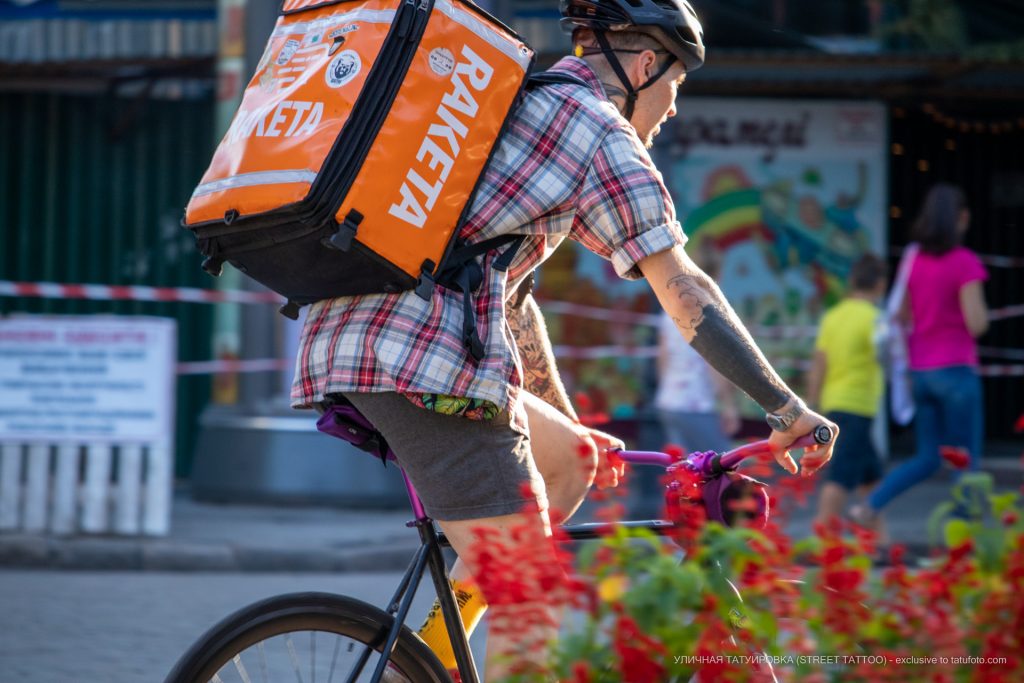 Rakietowy człowiek dostarczający jedzenie z tatuażem blackwork na ramieniu