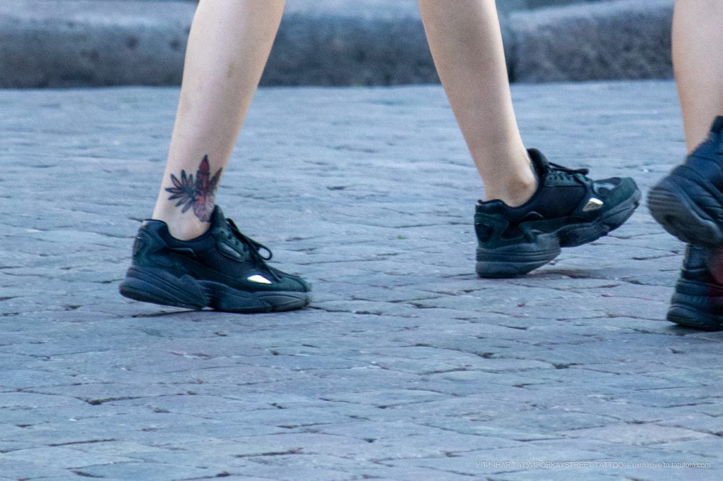 Dziewczyna z tatuażem z czerwonymi kwiatami na dole nogi