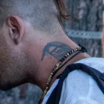 Tatuaż z sierpem na twarzy faceta i napisem NESS z twarzą diabła na jego ramieniu