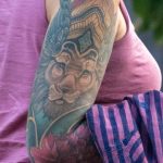 Tatuaż na rękawie z okiem Ra i motylem dla dziewczynki