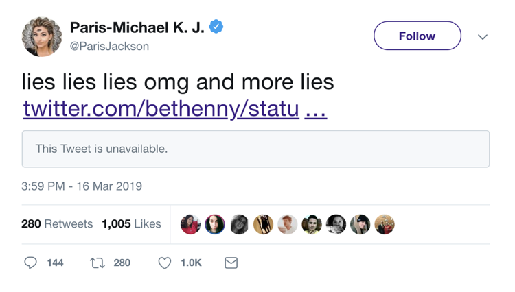 Potom, čo bola správa o jej očividnej hospitalizácii zverejnená, Paris odmietla pokus TMZ o samovraždu a tweetovala „F * ck you, you f * cking liers“. Tiež odpovedala na už odstránený tweet od Bethenny Frankel a pridala niekoľko emodži.