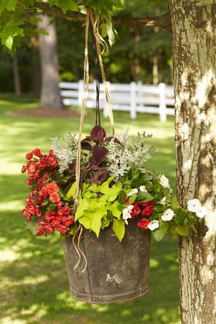 Vaša záhrada je plátno a záhradný dizajn je vaša kefa. Jeden z najlepších spôsobov, ako vyjadriť svoju kreativitu, je zavesiť zavesené koše na neočakávané miesta. Rastliny milujúce tieň v tomto závesnom koši vytvárajú jedinečnú škálu tvarov a výšok. Patria sem zelená ľalia, begónia, papradie a brečtan.