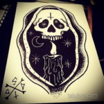 Czaszka z dłonią lub ułożonym na niej wieńcem, dziś mówi tatuażem o pełnym szacunku stosunku do zmarłego i pamięci.